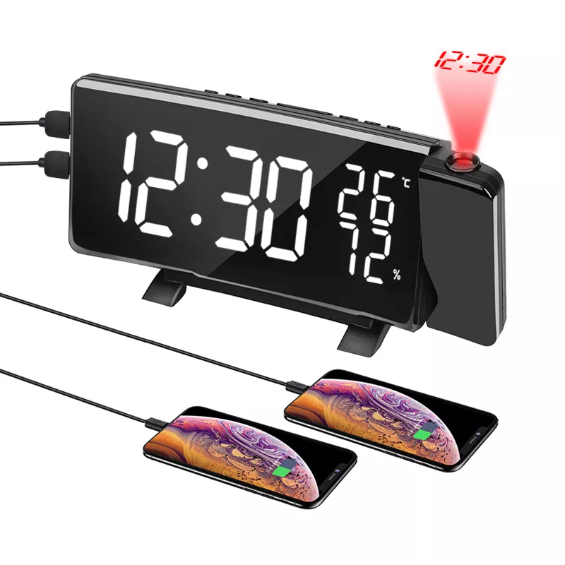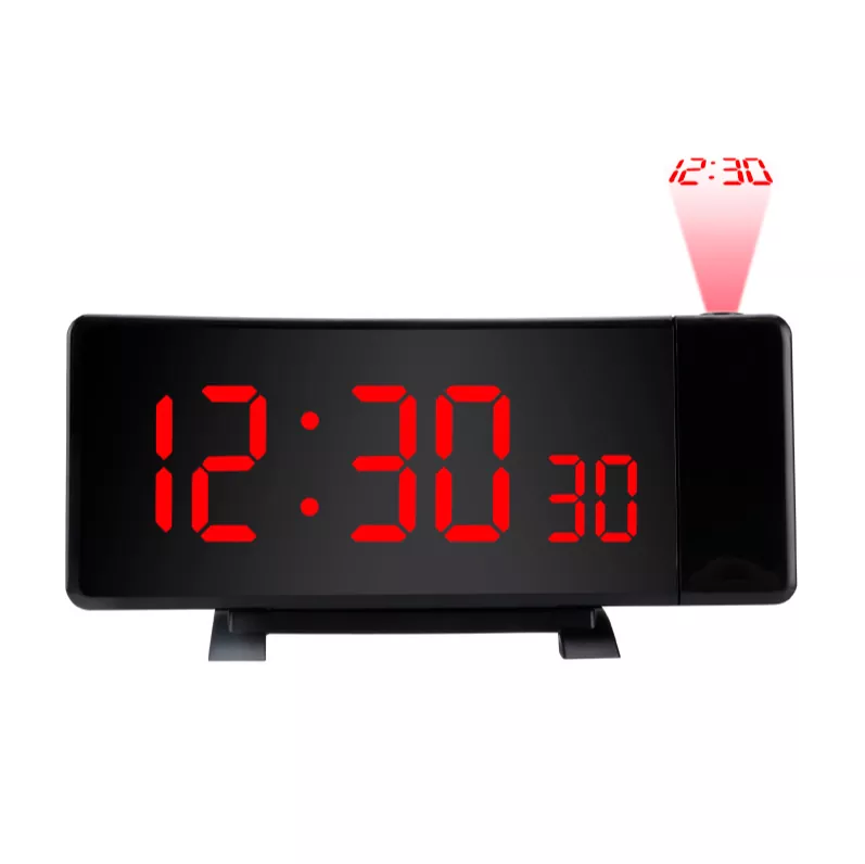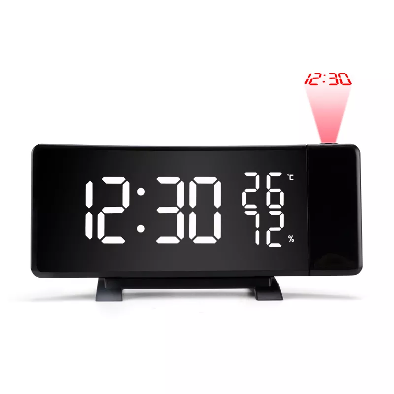 1. شاشة منحنية راديو FM أبيض أزرق أحمر شاشة عرض LED ساعة عرض، منبه (2 منبه)، درجة الحرارة والرطوبة